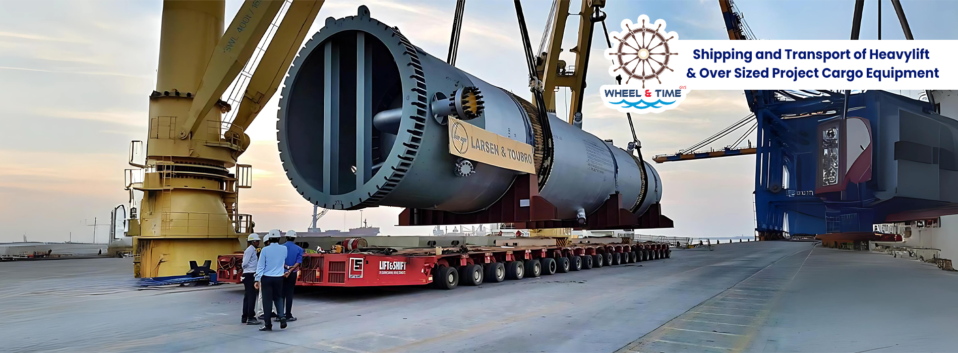 Wheel & Time specializes in Shipping Transport and Logistics of Heavylift & Over Sized Project Cargo Equipment, Wheel & Time extends its expertise and services on Lumpsum Turnkey Basis (LSTK) in Pre-Logistics Technical & Engineering studies, Transport Feasibility Reports with Logistics Budgeting, Global Shipping, Inland Transport by road, Coastal and Riverine routes, Customs Clearances, Port Handling & Inter-carting of Project Cargoes consisting of Break Bulk, Heavylifts & Over Dimensional Cargoes.
